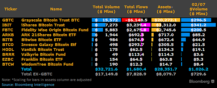 博链财经BroadChain获悉,彭博分析师James Seyffart发布的数据显示,2月7日现货