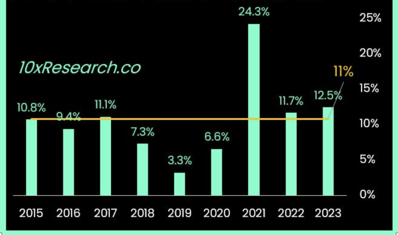 从 2 月 10 日起,比特币在农曆新年前后通常会上涨 11%。在过去 9 年裡,投资者若在农曆新年前 3 天𧹒入比特币,并在新年后 10 天卖出,这段期间比特币的价格几乎都会上升。