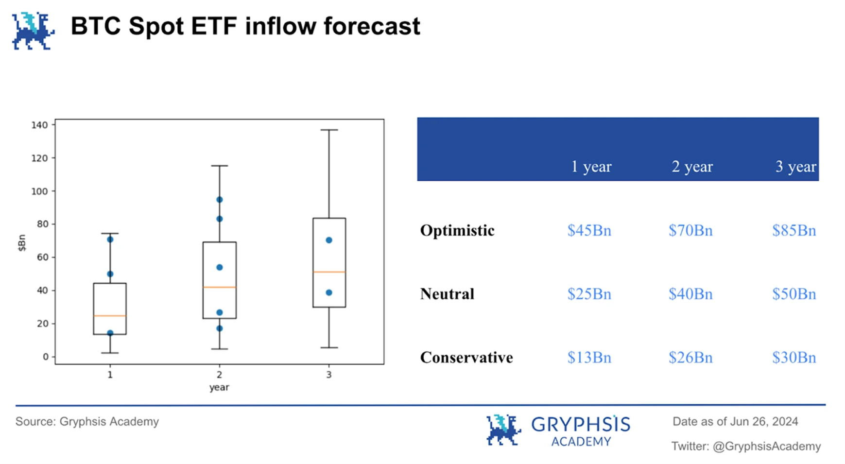 Galaxy 通过 BTC ETF 在资管平台的触达率,预计 BTC ETF 资金流入在第一年将达到 $ 14.4 Bn,第二年将达到 $ 26.5 Bn,第三年将达到 $ 38.6 Bn。