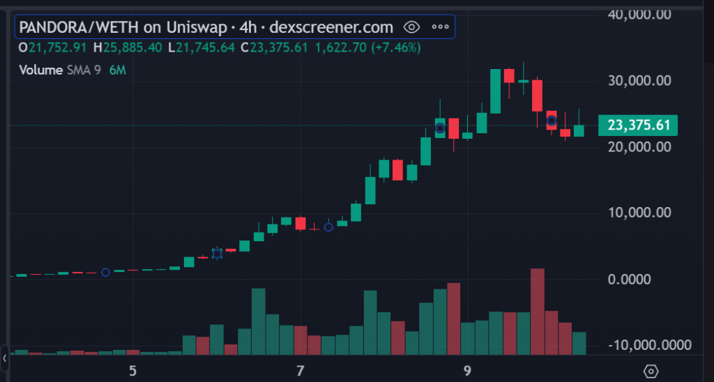 根据 dexscreener 显示,Pandora 代币在台湾时间昨日(9)晚间 6点左右一度涨至 32,850 镁,而至今已经回落,截稿时间报价为 23,449 镁元。行情波动极大,请读者务必谨慎小心。