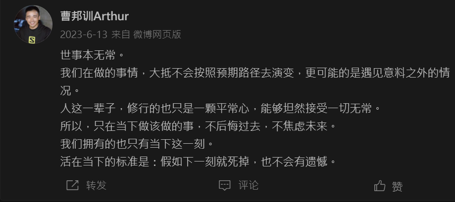 而曹欣生前最后一条留言停留在 1 月 28 日, 讲述 要将重点放到海外的印尼市场,称有许多不错的投资机会。而在数个月前更是突然发文感叹,世事本无常:「不后悔过去,不焦虑未来,我们拥有的也只有当下这一刻。活在当下的标準是:假如下一刻就死掉,也不会有遗憾」。