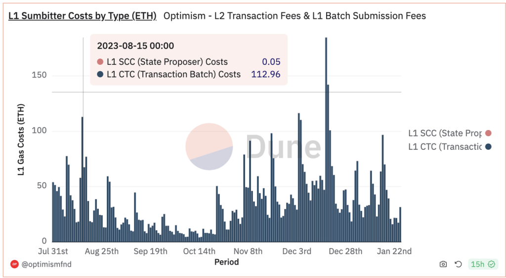 首先从成本项来看,结算层的支出非常少,Optimism 目前每天仅向 Ethereum 支付 0.05 ETH 左右的结算费用