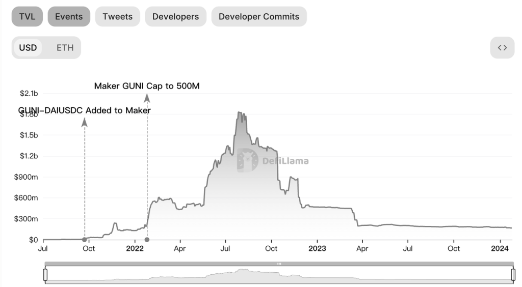 针对 Uniswap V3的头寸管理工具 G-UNI(A=token 价格达到某个值, B=调整 LP 做市区间),MakerDAO 在 21 年 9 月将 GUNI 的 USDC-DAI LP 添加为可以生成 DAI 的抵押物,GUNI 的 TVL 一度上涨至接近 20 亿美元。22 年,Gelato 将 GUNI 独立为 Arrakis Finance,并准备单独发币,不过随着 22 年 MakerDAO 业务重心转向 RWA,Arrakis 的 TVL 随之明显下降。