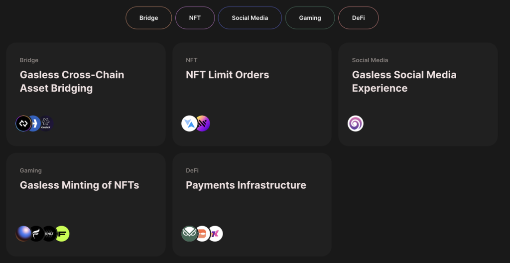 帮助跨链桥协议用户无 gas 跨链,具体用户有 Connext Network 和 Kinetex 。