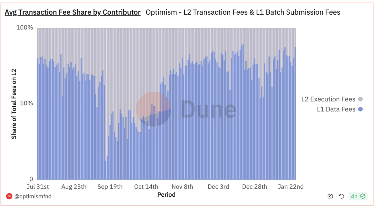 Optimism 执行层毛利(灰色)和 DA 层支出(蓝色)的占比( 来源同上 )