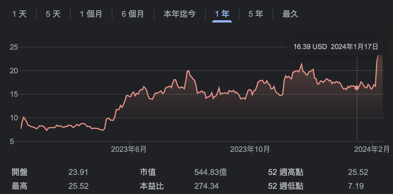 Peter Thiel 作为连续创业家,当前旗下也有知名数据公司 Palantir ,主要提供数据分析服务给政府机关、军事与商业活动,去年因 AI 需求大幅带动营收,实现 2023 年财年全年获利,股价在过去 1 年最低价 7.19 ,一路拉升至现价 25.5 左右,实现超过 3 倍的暴涨。