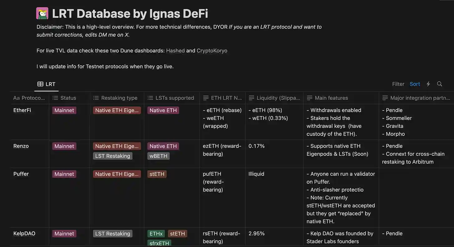 最初,我打算在这篇文章中涵盖所有的 LRT 协议。然而,包含所有协议会使文章变得过于冗长。因此,我建立了一个 Notion 仪表板,突出了关键的差异化因素。例如,它通过检查交易 1k LRT ETH 到 ETH 时的滑点来包含流动性资讯。你可以在这裡检视。