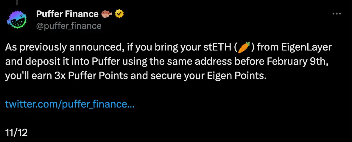 市场份额的主导地位很大程度上取决于谁先推出,但 Puffer(pufETH)作为一个后来者,迅速攀升至第二位,市场份额达到了 22%。这是为什麽呢?答案是:积分!