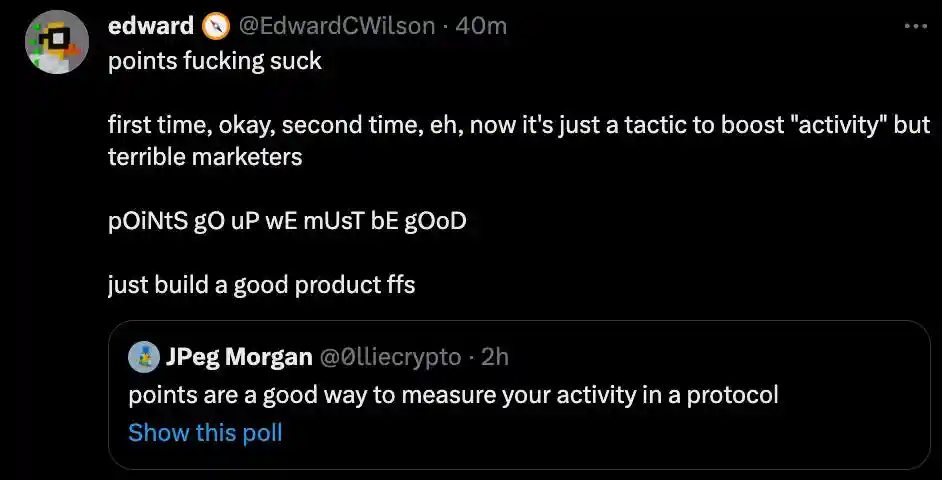 此外,我认为他们需要推出代币,因为积分疲劳现象已经𫔭始显现。如果他们不与 EIGEN 代币一起推出,我会感到非常失望。