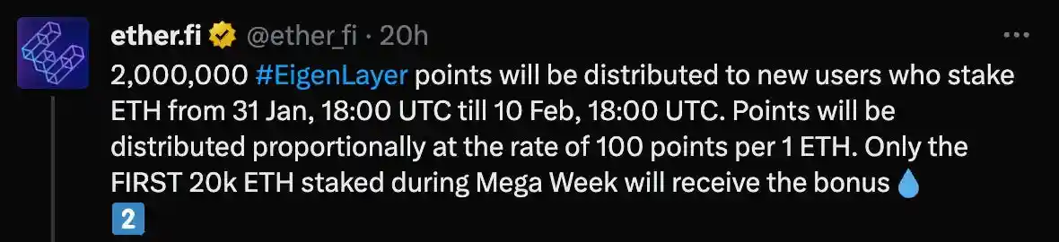 例如,Eigenpie 为 ETHx 存款者提供了额外的 120 万 Eigenlayer 积分,活动将持续到 2 月 9 日。同时,EtherFi 也从其国库中为新存款者提供了 200 万 Eigenlayer 积分(在 EtherFi 积分之外),活动截止到 2 月 10 日。