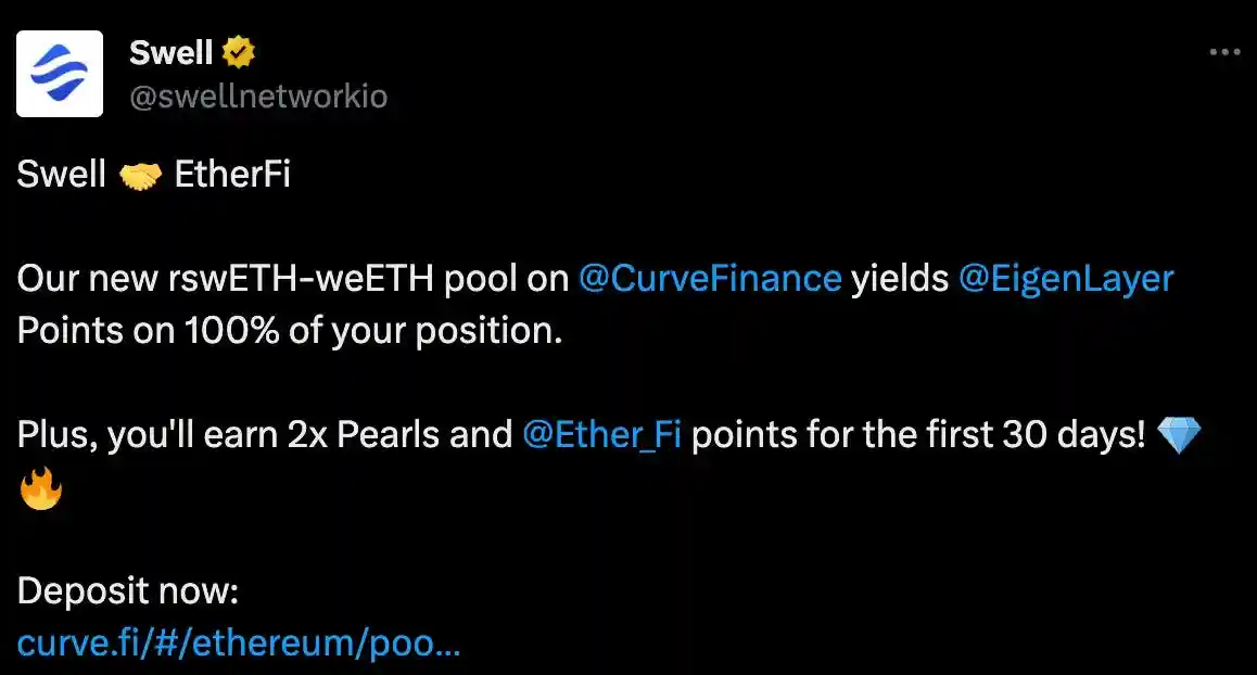 Swell x EtherFi 似乎已经意识到了这一点,他们采取了一种非竞争性的策略。通过合作而非对抗,他们在 Curve 上推出了一个共享的 rswETH/weETH 池,这个池子为使用者提供了双倍的 Pearls 和 EtherFi 积分奖励。这种策略有助于他们在再质押领域建立更广泛的合作伙伴关係,从而可能在竞争中获得优势。