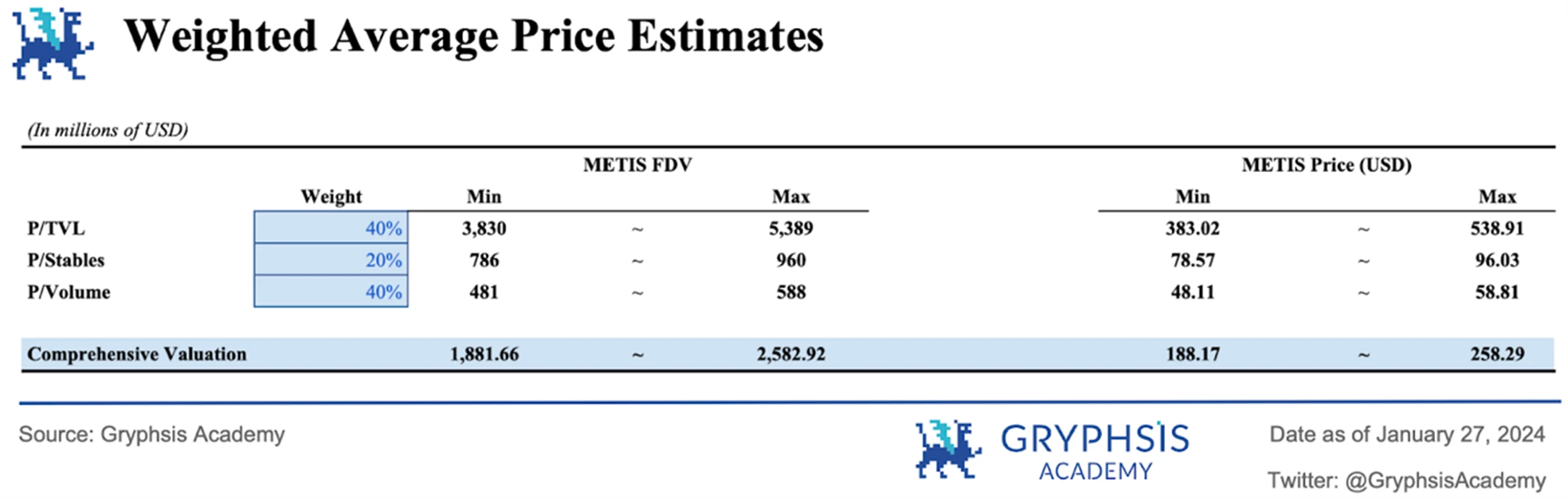 在确定 $METIS 的最终价格范围时,我们的估值模型对基于三个比率(FDV/TVL、FDV/Stables、FDV/Volume)计算出的价格估算进行了加权平均。权重分布如下:FDV/TVL 占 40% ,FDV/Stables 占 20% ,FDV/Volume 占 40% 。此分配是基于认为 FDV/TVL 和 FDV/Volume 相比于稳定币数量,更能体现网络的经济活动的看法。这种加权方法得出的结果是 $METIS 的最终价格区间为 188.17 美元至 258.29 美元。这表明 $METIS 的价格有潜力从当前市场价格增长 2 至 2.9 倍。