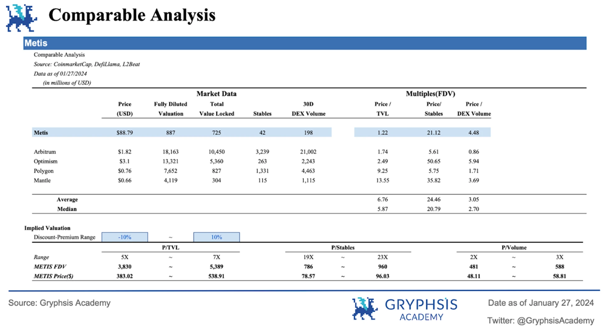 我们的分析随后根据平均值和中位数计算出每个指标(FDV/TVL、FDV/Stables、FDV/Volume)的范围。这样做是为了减少仅依赖数据集中极端值可能导致的偏差。通过同时考虑平均值和中位数,我们的目标是更平衡、更具代表性地理解 $METIS 在第二层网络(L2)中的定位。