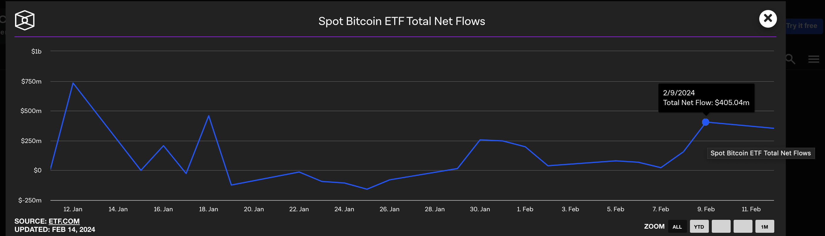 依照所有比特币现货 ETF 产品来看,自 1 月 29 日起,持续呈现净流入,2 月 9 日当天更创下 4 亿美元的新高。