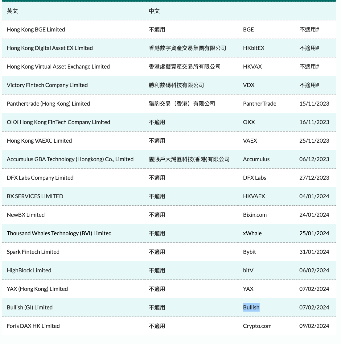 值得一提的是,在去年 12 月 10 日列入该名单的平台 Meex 的申请已于 2 月 7 日被退回,此外,除了此前明确表态将放弃申领香港牌照的交易所 Bitget 外,曾传出要采取行动的币安(Binance)、火币(HTX)与 Gate.io 等知名平台,目前均未出现在证监会公布的名单中。