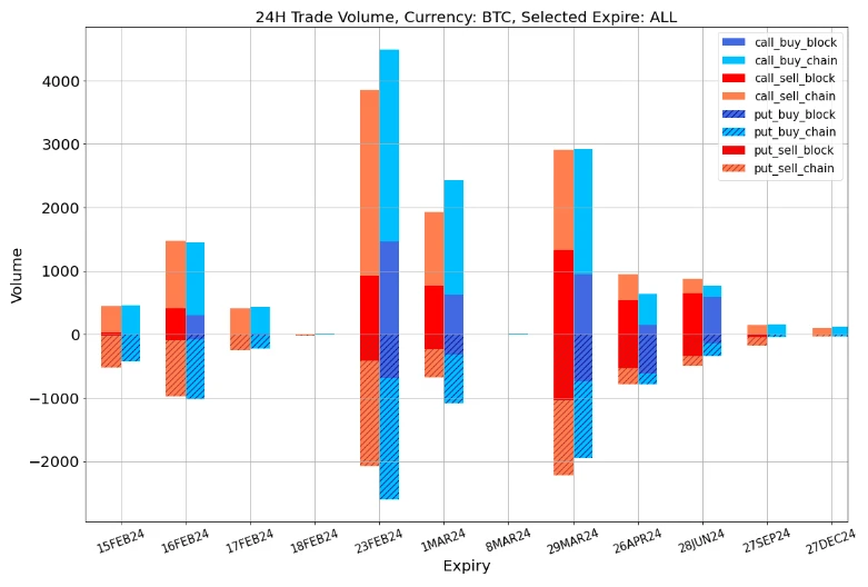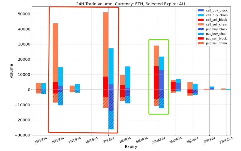 交易方面,ETH 本周和月末的 Call 遭到大量抛售,其中包括大量处在 2300-2400 之间的止盈订单,三月底则是集中了以 Buy 2700 vs 3200 Call Spread 为代表的看涨策略,除此以外还有诸如 Buy 29 MAR 3200-C vs Sell 26 APR 4000-C 这样买近卖远的三角价差,相似的交易我们也能在 BTC 上观察到,例如 Buy 29 MAR 60000-C vs Sell 75000-C(350 BTC per leg)