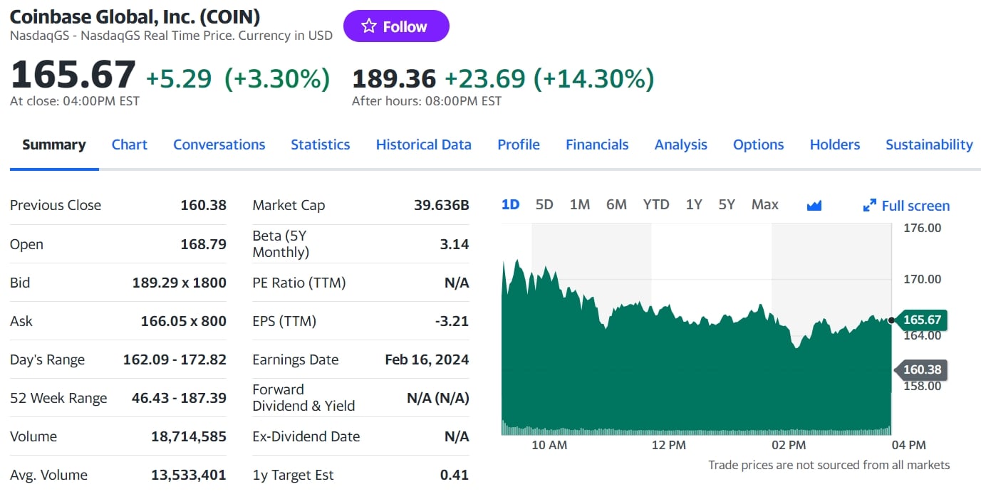 原本 Coinbase 股价 15 日收涨 3.3% 至 165.67 美元,已创下 2023 年 12 月 29 日以来收盘新高,而在亮眼的财报公布后,盘后更大涨 14.3% 至 189.36 美元。