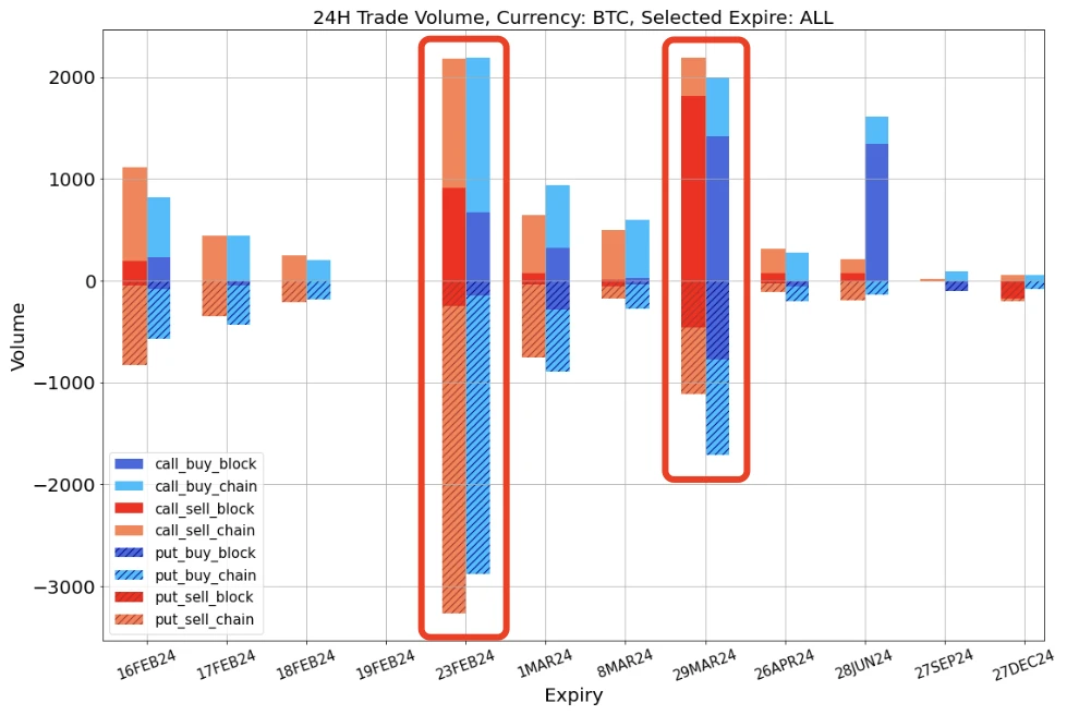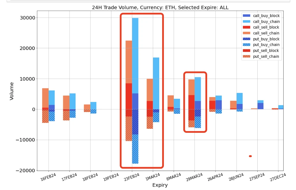 数字货币方面,市场对 BTC 的看涨情绪在来到 52000 美元关口附近后快速衰弱,过去 24 小时价格维持小幅震荡(-0.08% ),使得包括 ETH 在内的期权隐含波动率曲面走陡,前端下跌 1.5-2.5% Vol 左右,从交易分布能观察到 23 FEB 52000 vs 48000 Put Spread 的博弈,卖压略胜一筹,同时远端仍有以 29 MAR 24 65000 vs 75000 Call Spread 为代表的大宗看涨策略建仓(720 BTC per leg)。另一方面,ETH 的上行势能还在延续,日内收涨至 2819.22 (+ 1.53% ), 23 FEB 2300/2500 和 1 MAR 2650 附近出现大量平仓看涨实值期权的止损单。