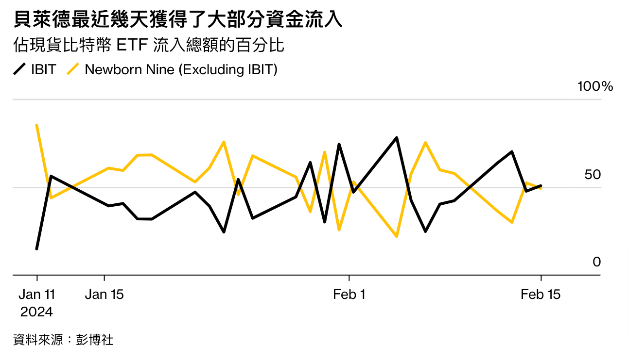 比 特币现货 ETF 自 1 月 11 日上市一个多月以来,𧹒气仍相当旺盛,机构持续大量加仓。据彭博汇编的数据 显示 ,本周已有近 25 亿美元流入比特币现货 ETF!其中贝莱德发行的 IBIT 占据本周资金流入总额的高达 58%,比其他对手的总和还多。