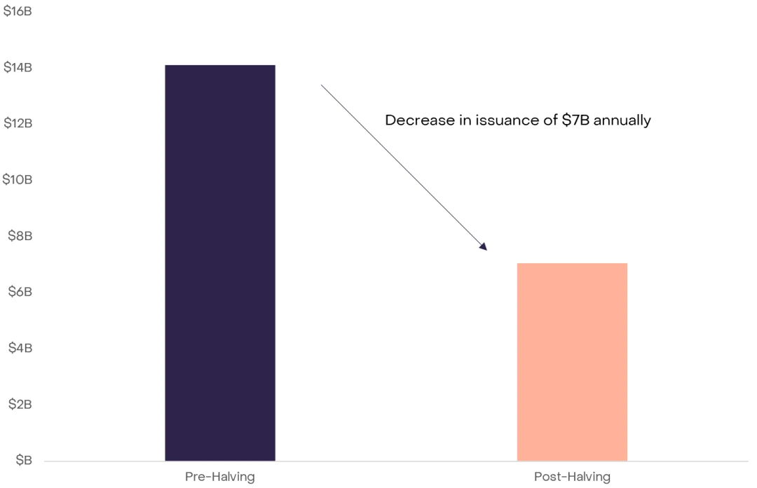 除了基本上积极的链上基本面之外,比特币的市场结构看起来有利于减半后的价格。从历史上看,区块奖励给市场带来了潜在的卖压,可能导致所有新挖掘的比特币都被出售,从而影响价格。目前每个区块挖掘的 6.25 比特币相当于每年约 140 亿美元(假设比特币价格为 43, 000 美元)。为了维持当前的价格,每年需要相应的购买压力为 140 亿美元。减半后,这些需求将减半:每个区块只有挖掘的 3.125 比特币,这相当于每年减少到 70 亿美元,有效减轻了卖压力。
