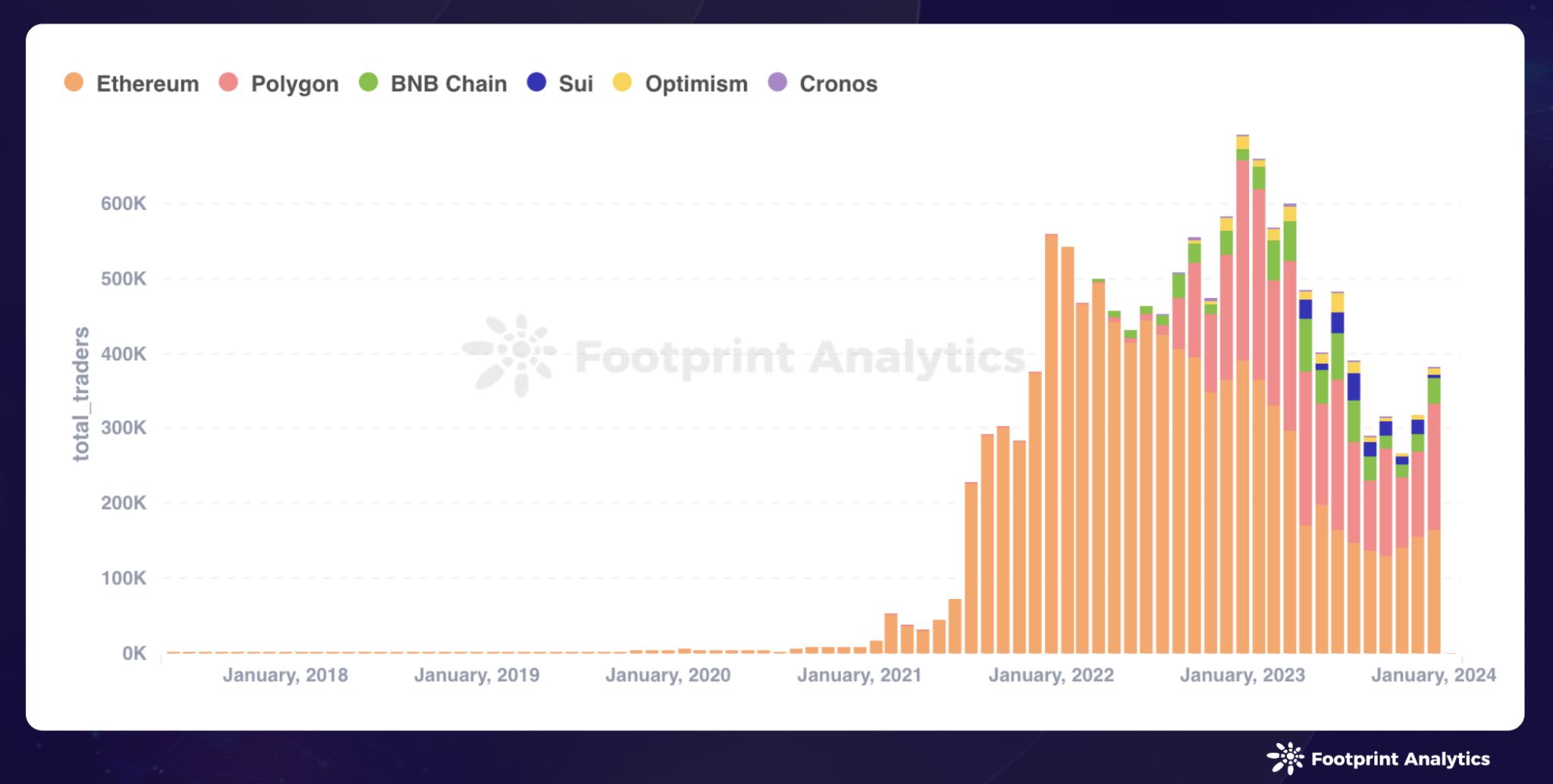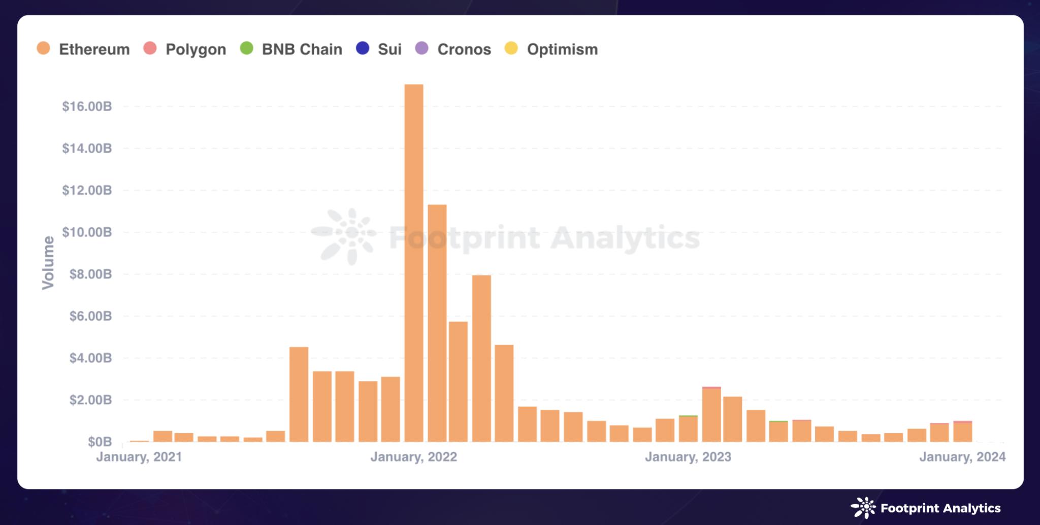 更多关于 1 月 NFT 行业的解读,您可以阅读来自 Footprint Analytics 的 NFT 月报:《 1 月 NFT 市场动态:Polygon 增长,Mooar 崛起,TinFun 掀起文化浪潮 》。