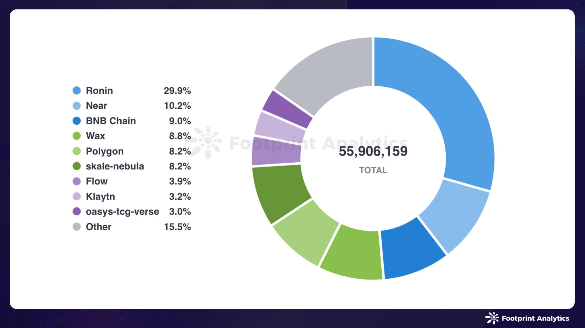 在交易量这一指标上,BNB Chain、Ronin 和 Ethereum 位列前茅, 分别占据总3.77亿总交易量的32.8%、 15.9% 和 15.8%。