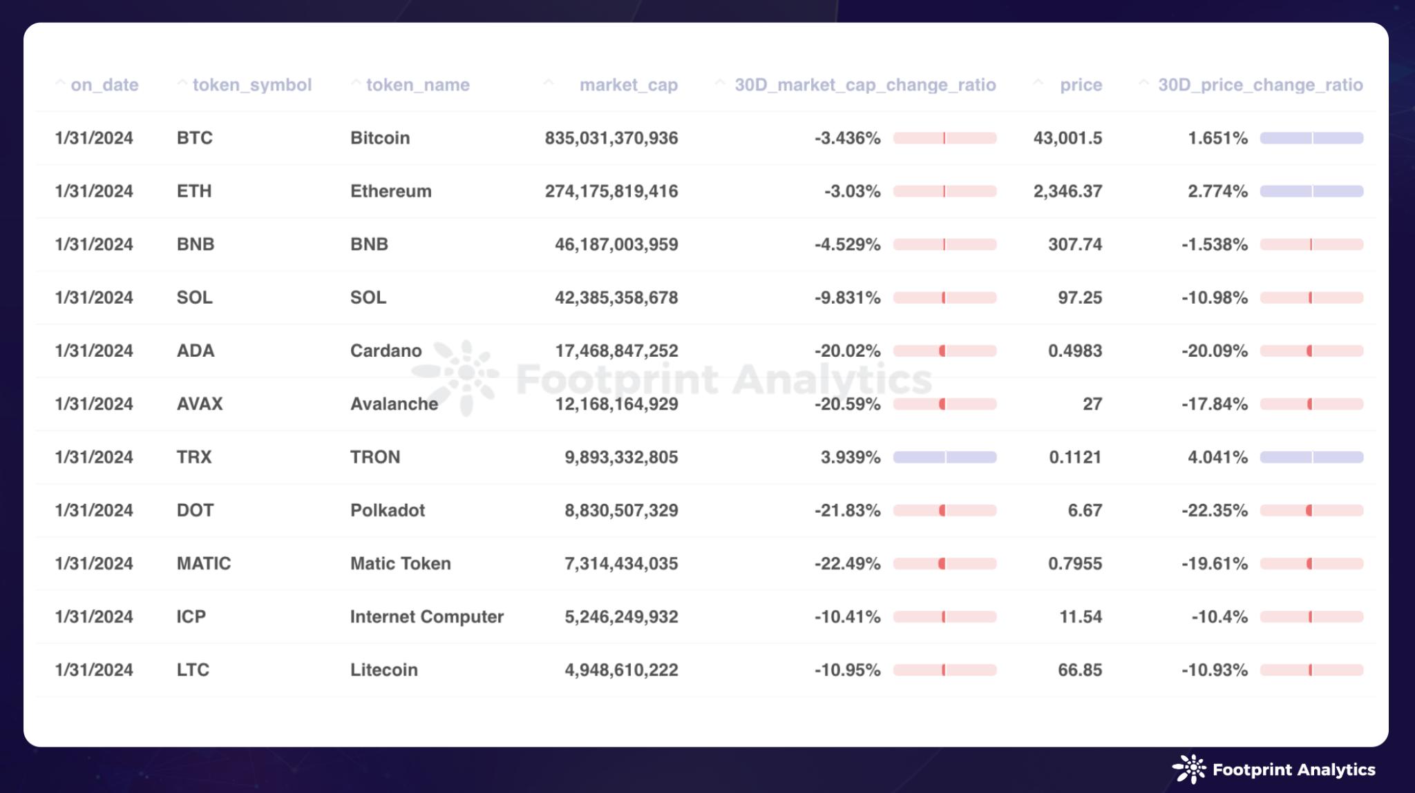 比特币和 以太坊 的价格在月内保持相对稳定,而其他代币的表现则不尽如人意。在市值排名前十的加密货币中,TRX 是个例外,其价格上涨了 4.0%, 而 BNB 、SOL、ADA 和 AVAX 等代币的价格在 1 月份均出现下跌。此前,在比特币 ETF 通过预期的推动下,加密货币价格在12 月份经历了一波上涨,但随后市场出现了回调。