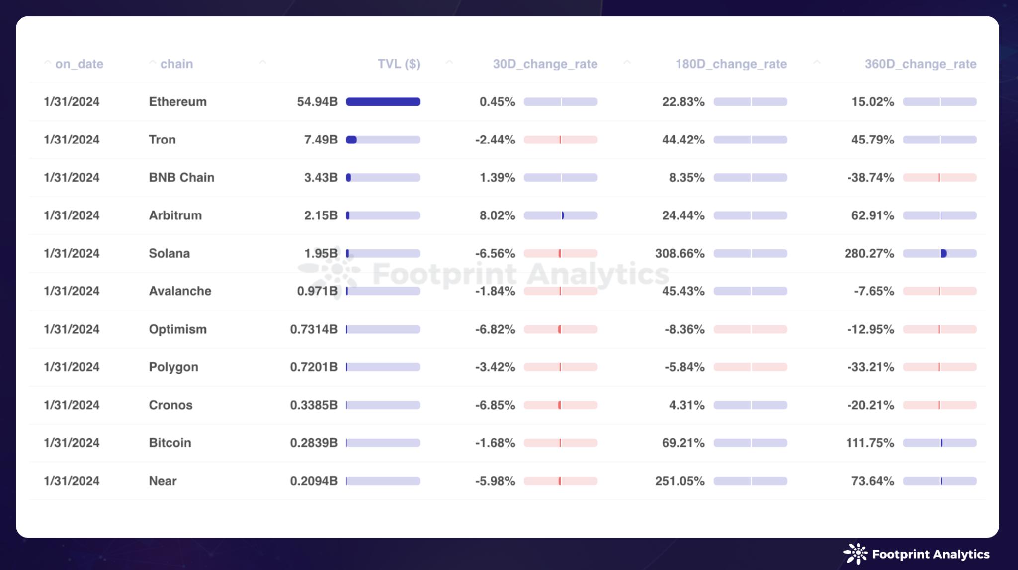 1 月底,公链领域的总价值锁定(TVL)达到了 751 亿美元。其中, 以太坊 以 73.2% 的市场份额领先,TVL 为 549 亿美元。波场和 BNB 链紧随其后,分别占据了 10.0% 和 4.46% 的市场份额,对应的TVL 为 75 亿美元和 34 亿美元。