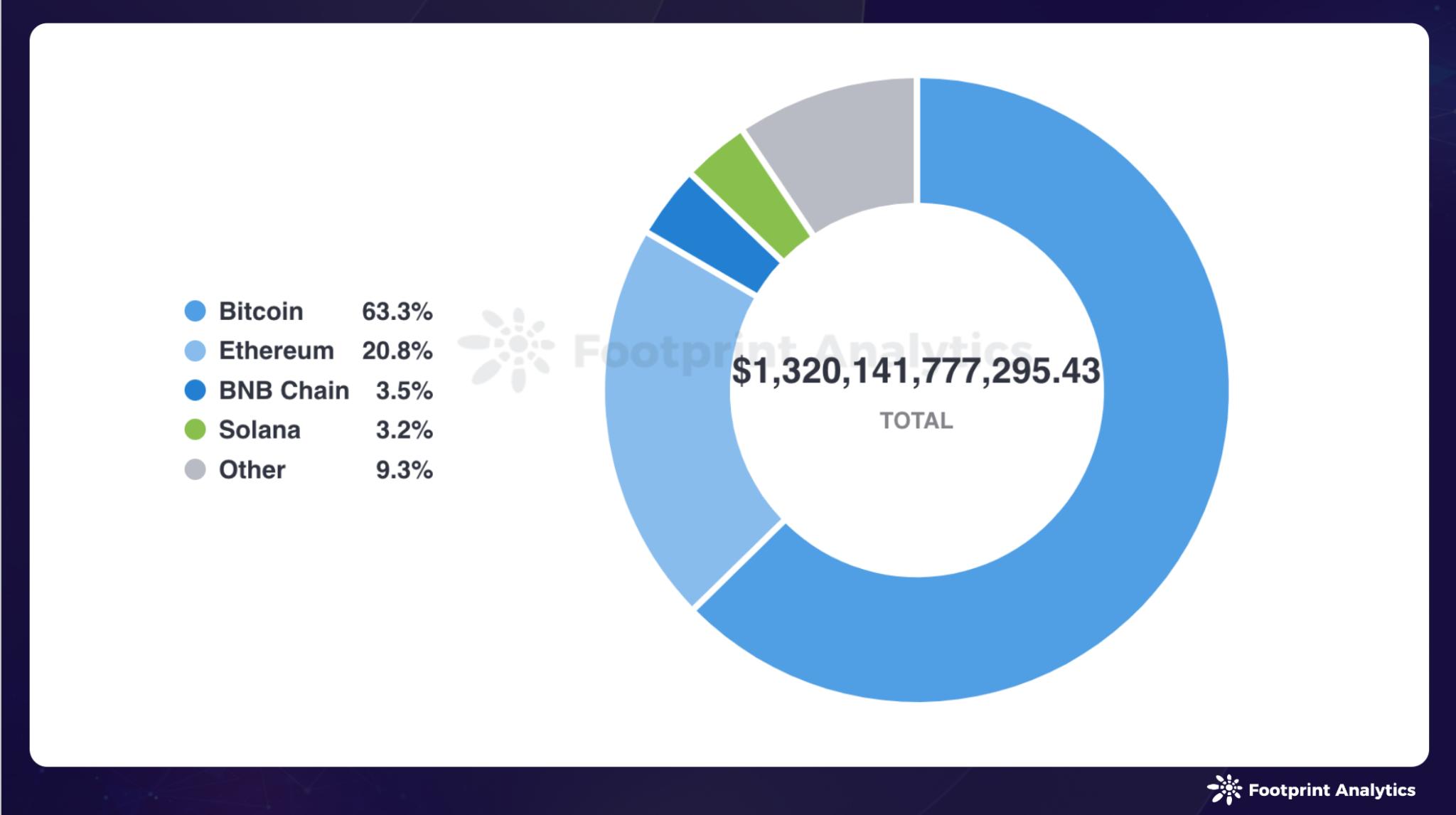 到 1 月底,公链加密货币的总市值达到了 1.32 万亿美元,其中比特币、 以太坊 、 BNB 链和 Solana 等主流公链占据了主导地位,市场份额占比分别为 63.3%、20.8%、3.5% 和3.1%。
