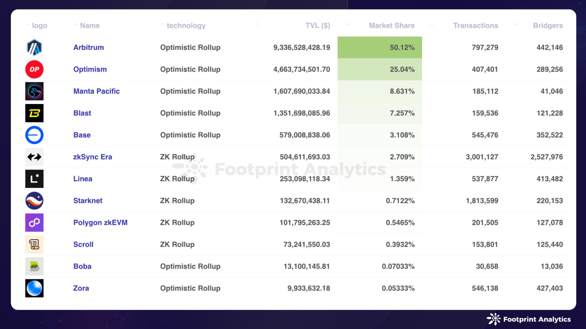 Arbitrum 的 TVL 在一个月内实现了 10.3% 的增长,从 85 亿美元跃升至 93 亿美元,进一步巩固了其在 Layer 2 市场的领先地位。与此同时, Manta Pacific 的 TVL 也实现了惊人的 164.3% 的增长,使其迅速崛起为第三大以太坊 Layer 2 解决方案。另一方面, Blast 的 TVL 也实现了显著增长,从 11 亿美元增加到 14 亿美元,涨幅达到了 20.5 %。值得一提的是, Linea 的 TVL 实现了 41.8% 的增长,从 1.8 亿美元增长到了 2.5 亿美元。