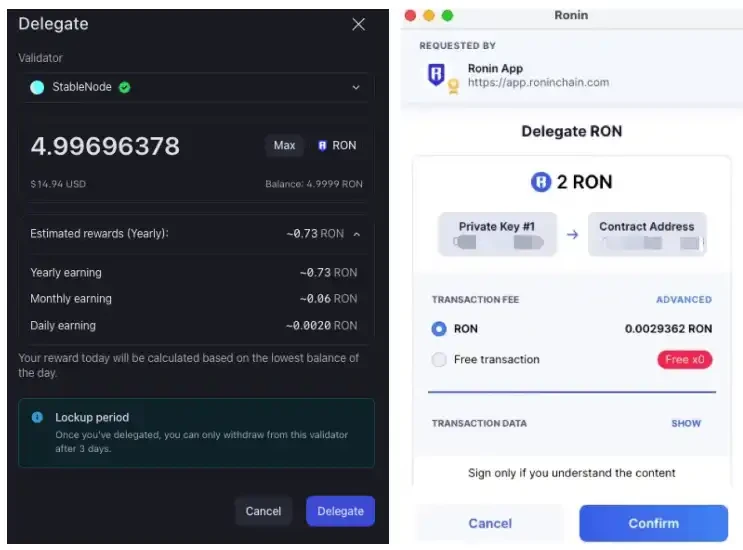 点击「Delegate」后,在弹出的界面中输入所要质押的 RON 数额,可以预览每日、每月和每年的质押奖励金额。确认后完成签名即可进行质押。