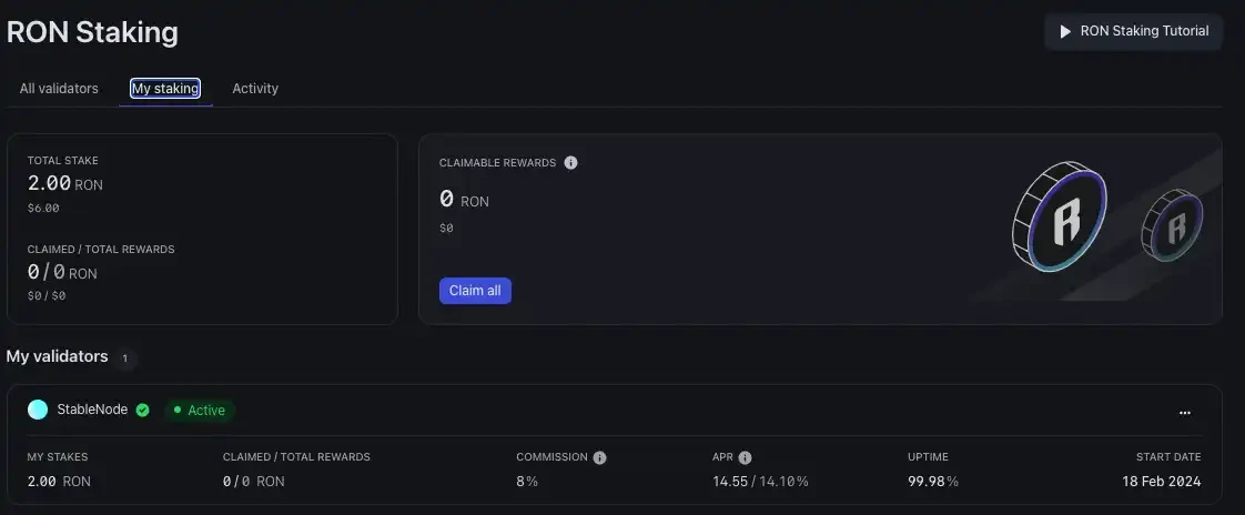 回到 Ronin 官网的质押页面,点击 My staking 选项卡可查看正在质押的 RON 资产情况。