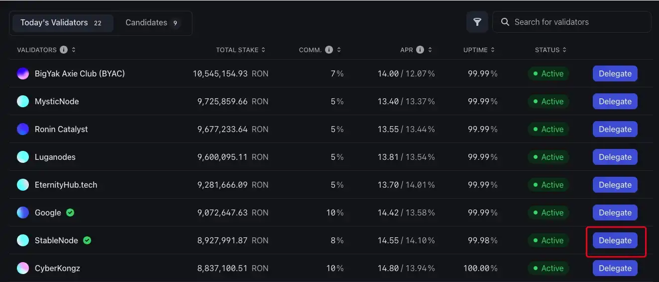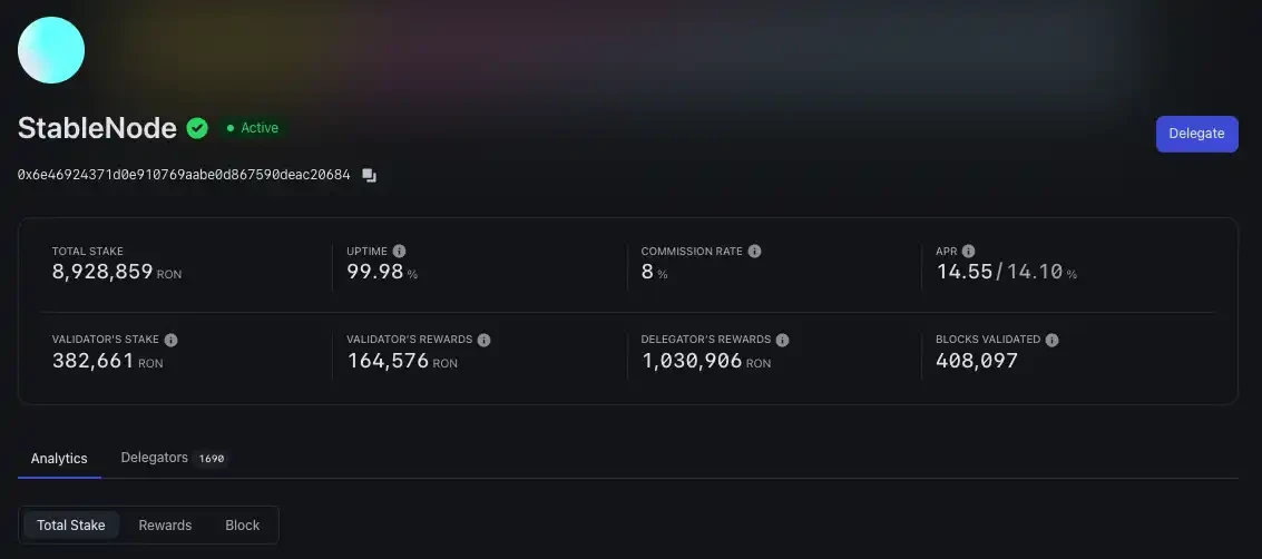Ronin 网络已经拥有 22 个验证节点,选择想要参与的验证节点,点击「Delegate」进行质押。如果想要了解所选中的验证节点,点击节点名称打开详细信息页面,可了解该节点的参与人数、委托奖励、APR 等指标。