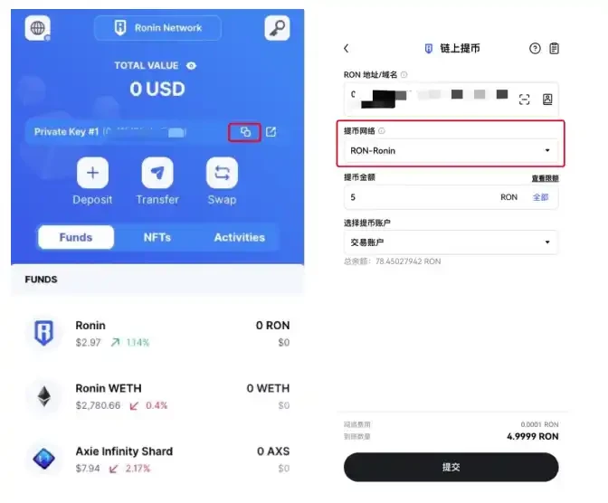 质押 RON 需要通过 Ronin Wallet 进行,通过 官网渠道 下载浏览器扩展,设置密码、保存助记词后即可创建基于 Ronin Wallet 的钱包账户。目前,除了即将上线 RON 的 Binance 外,提供 RON 交易对的 CeFi 平台还有 OKX。选择 Ronin 网络,将持有的 RON 发送至 Ronin Wallet 上的钱包地址。