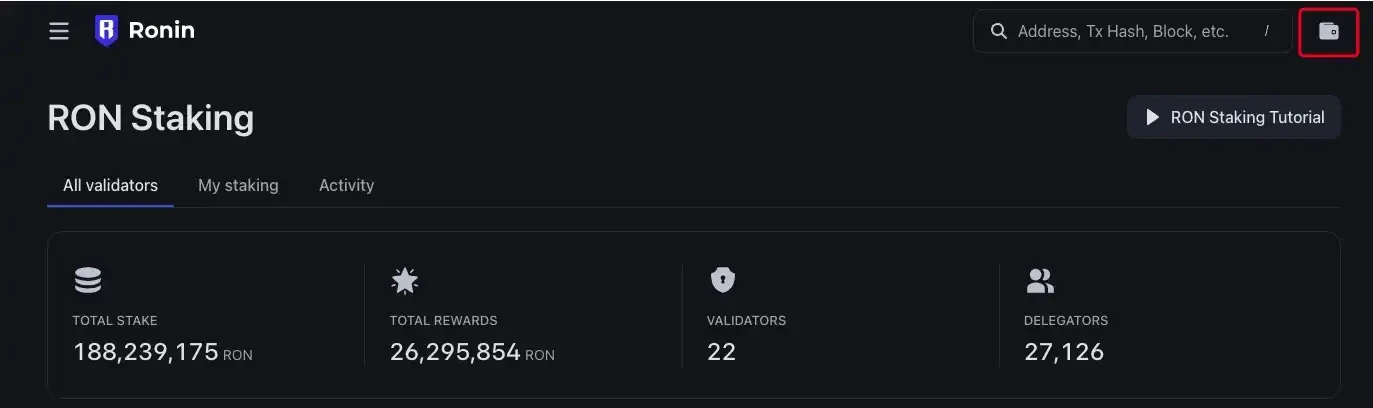 从 Ronin 官网进入 质押界面 ,点击右上角钱包图标,连接自己的钱包。
