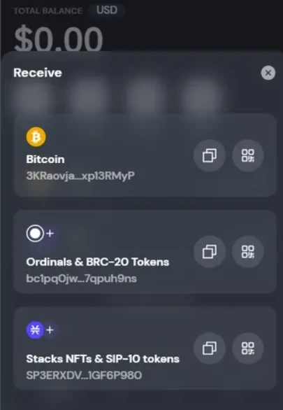 当点击 “发送” 或 “接收” 时,你的钱包会显示三个不同的比特币地址,与银行帐号类似,在发送或接收资金时必须提供这些地址。在这里,Xverse 的用户友好性派上了用场。