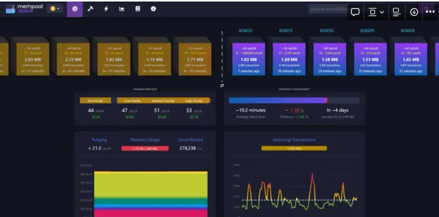 在这里你可以查看几个指标,例如当前 gas 费用、区块高度和平均区块时间。内存池区块浏览器还投射了比特币区块链的视觉效果,其中待处理的区块为橙色,已确认的区块为蓝紫渐变色。在右上角,您可以输入任何交易 ID 或钱包地址来获得更多详细信息,例如该交易在队列中的位置或者特定地址持有的代币。总体而言,内存池是与应用程序交互时跟踪交易的重要工具。