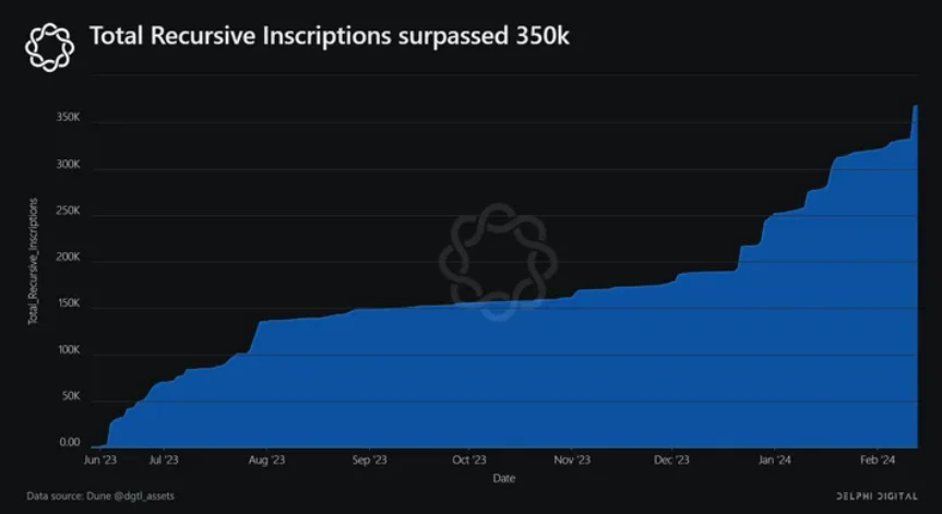 铭文领域最早的突破性发展之一是递归 (recursion) 的引入。递归铭文于 2023 年 6 月首次受到关注,最近递归铭文总数已经超过 35 万。