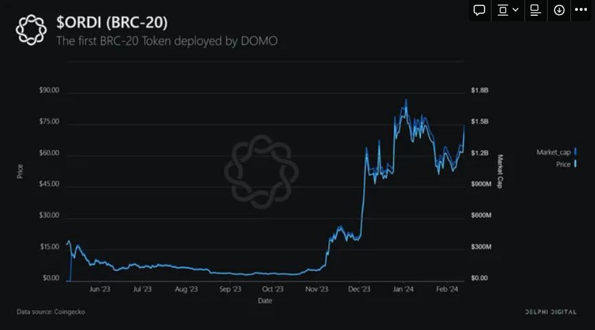 最初由 Domo 创建的 BRC-20 代币合约是 $ORDI。最初,每批 1, 000 ORDI 的铸造费是 5 美元。最近,$ORDI 的市值超过了 14 亿美元,而目前的代币交易价格是 67.72 美元!这意味着如果有人以 5 美元的价格铸造了一批原始的 1, 000 ORDI,现在的价值已经超过 67, 000 美元。