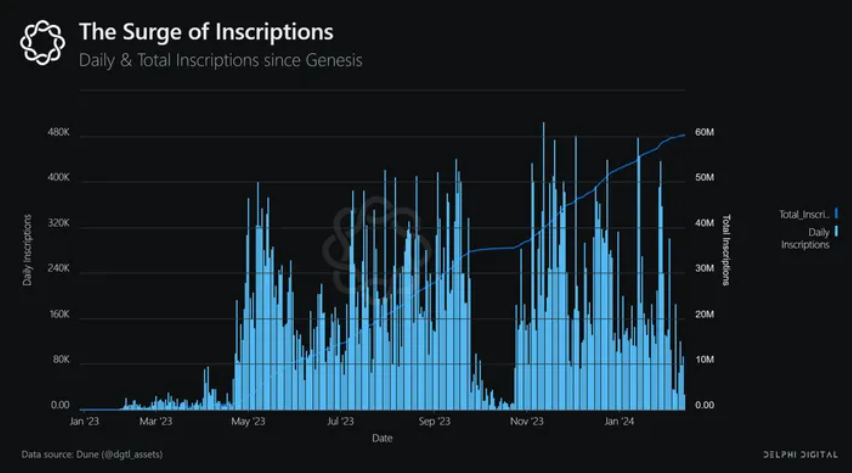 2023 年 2 月初,铭文总数超过 6000 万,展示了该生态蓬勃发展的强劲势头。