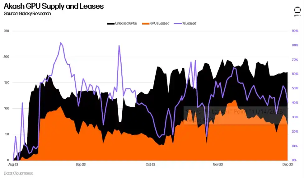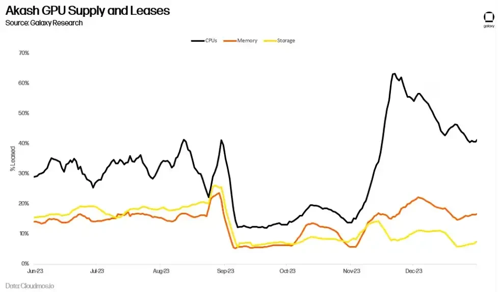 目前尚不清楚,对用于 AI 训练的 GPU 的需求激增是否会转化为 Akash 网络的长期使用量。长期以来,Akash 一直为 CPU 提供了一个市场,例如,以 70-80% 的折扣提供类似于中心化替代方案的服务。然而,更低的价格并没有导致显著的采用。网络上的租赁活动已经趋于平缓, 2023 年第二季度的平均计算资源利用率仅为 33% ,内存利用率为 16% ,存储利用率为 13% 。尽管这些对于链上采用来说是令人印象深刻的指标(作为参考,领先的存储提供商 Filecoin 在 2023 年第三季度的存储利用率为 12.6% ),但这表明供应继续超过对这些产品的需求。