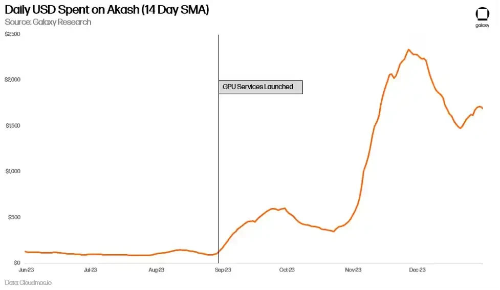 Akash 的每日支出也有所增加,相对于 GPU 出现之前几乎翻了一番。这部分归因于其他服务使用量的增加,尤其是 CPU,但主要还是新 GPU 导致的。