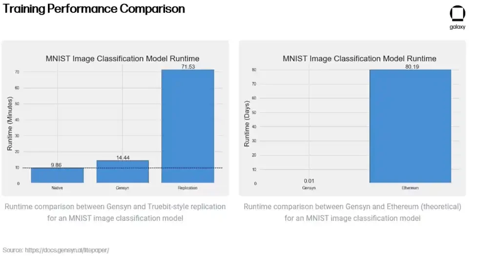 除了其创新的验证方法外,Gensyn 还声称相对于中心化替代方案和加密竞争对手来说具有成本效益 - 提供的 ML 训练比 AWS 便宜高达 80% ,同时在测试中胜过类似项目 Truebit。