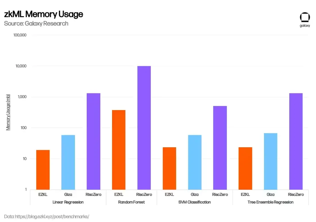 在过去几个月中,EZKL 在增强其 zkML 解决方案方面取得了显著进展,主要集中在降低成本、提高安全性和加速证明生成方面。例如,在 2023 年 11 月,EZKL 集成了一个新的开源 GPU 库,将总体证明时间减少了 35% ,并且在 1 月份,EZKL 宣布了 Lilith,这是一个软件解决方案,用于在使用 EZKL 证明系统时集成高性能计算集群并协调并发作业。Giza 独特之处在于,除了提供创建可验证机器学习模型的工具之外,他们还计划实现 Hugging Face 的 web3 等效版本,为 zkML 协作和模型共享开设一个用户市场,并最终集成去中心化的计算产品。在 1 月份,EZKL 发布了一个基准评估,比较了 EZKL、Giza 和 RiscZero(下文讨论)的性能。EZKL 表现出更快的证明时间和内存使用率。