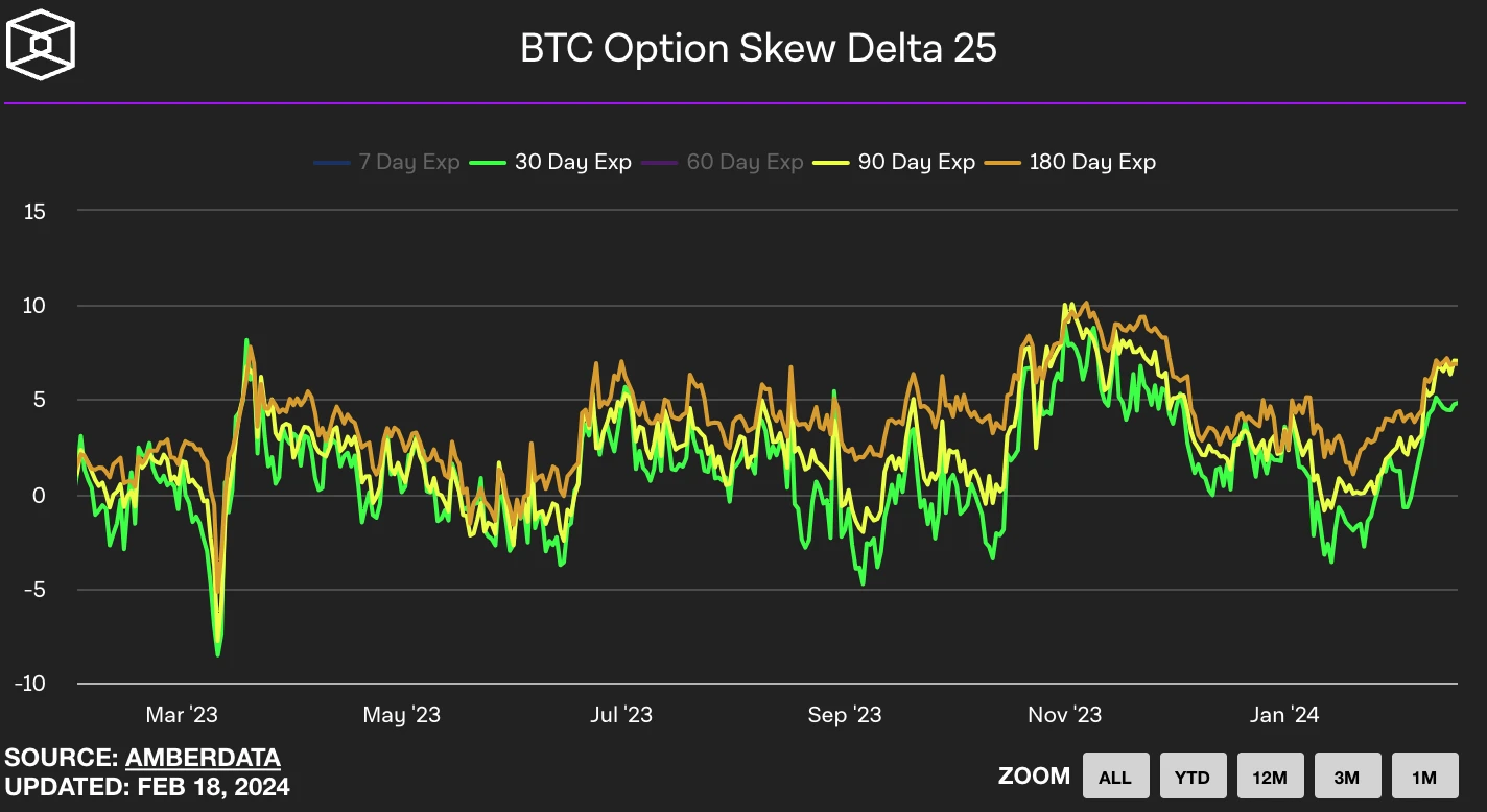 BTC 25 Delta 期权偏度正偏表明看涨期权比看跌期权更贵(或需求更高),但正偏程度还不算极端, 30 天 Call 比 Put 隐含波动率高出 4.8 个百分点 90 和 180 天高约 7 个百分点: