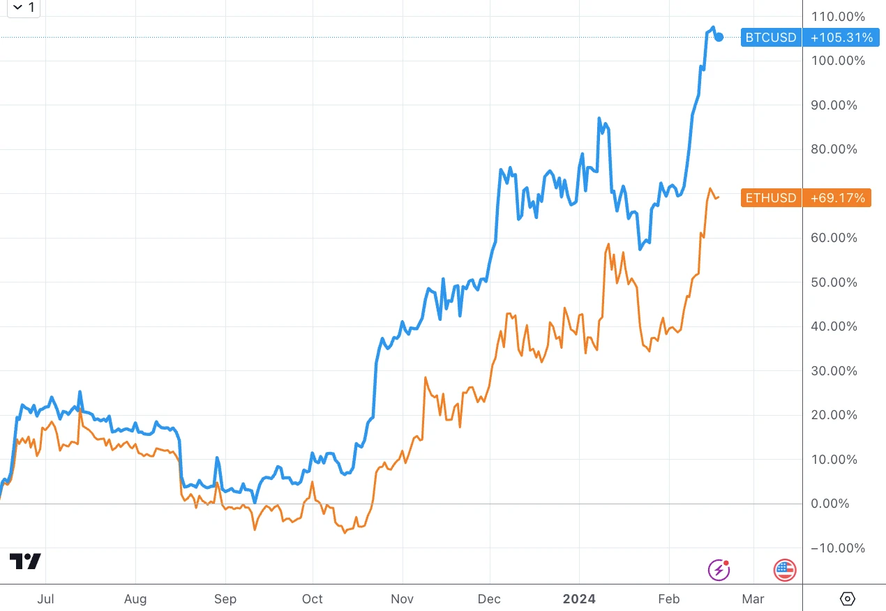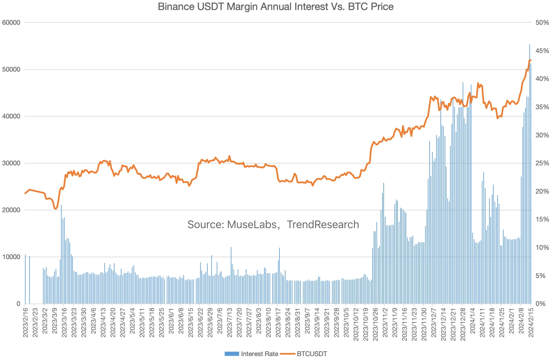 合约市场和现货市场的持仓量同时升高,为加密市场增加了流动性和波动性。一般来说当价格和 OI 同时急剧上升时,这可能表明市场过热。这种现象大多伴随投机性买盘推高价格,随着投资者情绪达到极度乐观,负面新闻或事件可能导致市场踩踏反转。但重点是如今 BTC 有强劲的、新问世的 ETF 流入,整体持仓量再上一个台阶是合理的,不能完全横向对比历史来判断是否过热。