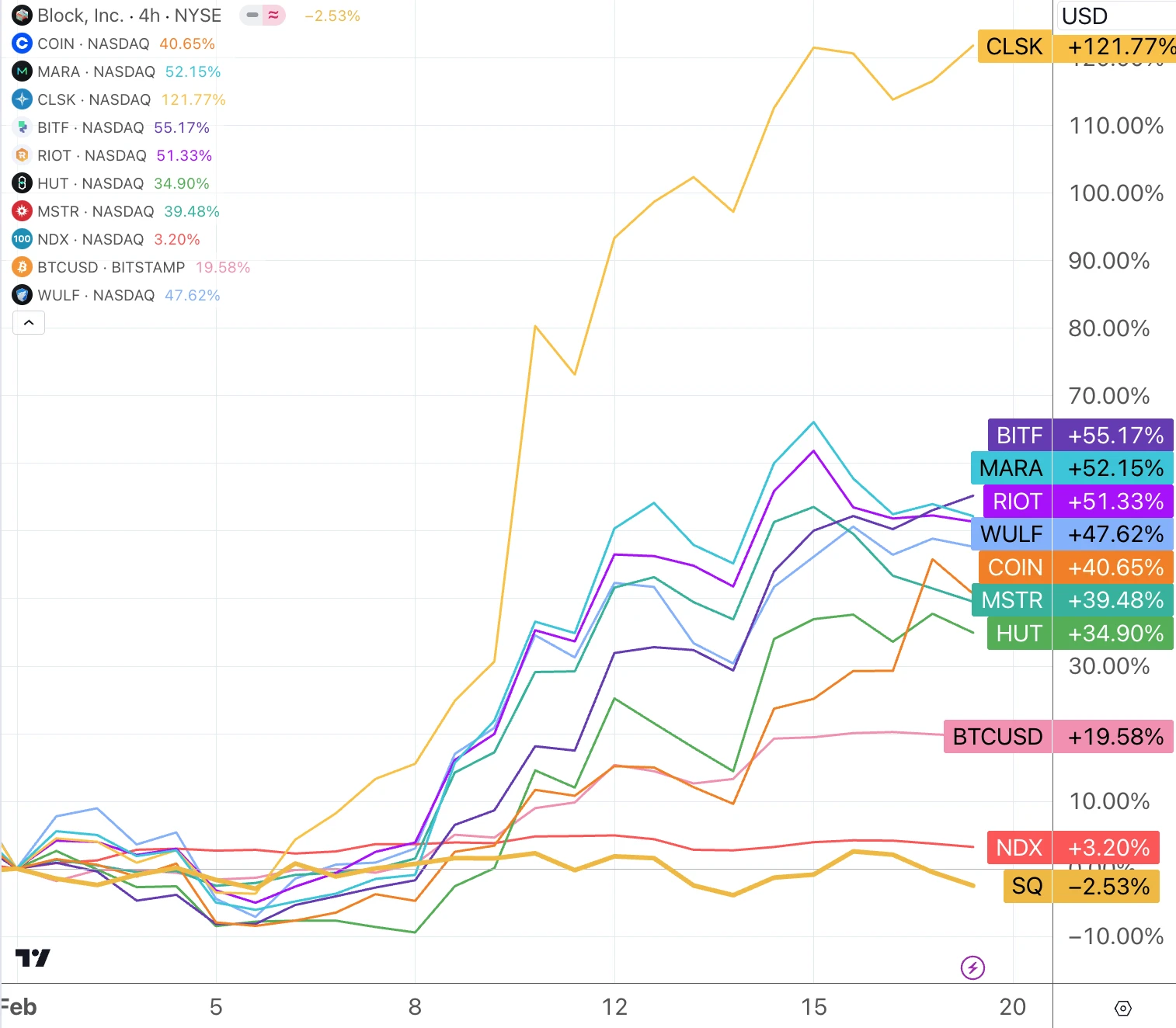 2 月以来加密货币概念股大涨,尤其是 BTC 矿企涨幅远超比特币本身。其中$CLSK 上周宣布在美国佐治亚州桑德斯维尔工厂完成了首个 100 兆瓦扩建项目的通电。这一成就使 Cleanspark 算力增长 40% ,突破了 14 EH/s 目前位列美股上市公司第三,叠加大超预期的一季度财报让$CLSK 成为加密股票中最亮眼的一支 :