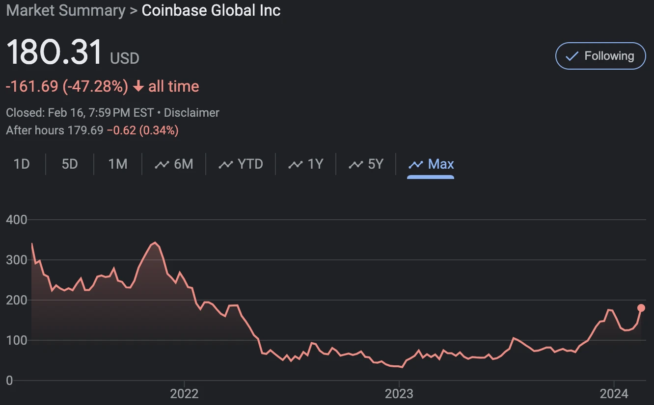 Coinbase 股票随后收涨 9 %价格为 180 美元,但仍远低于其在 2021 年首次亮相后的 381 美元开盘价。