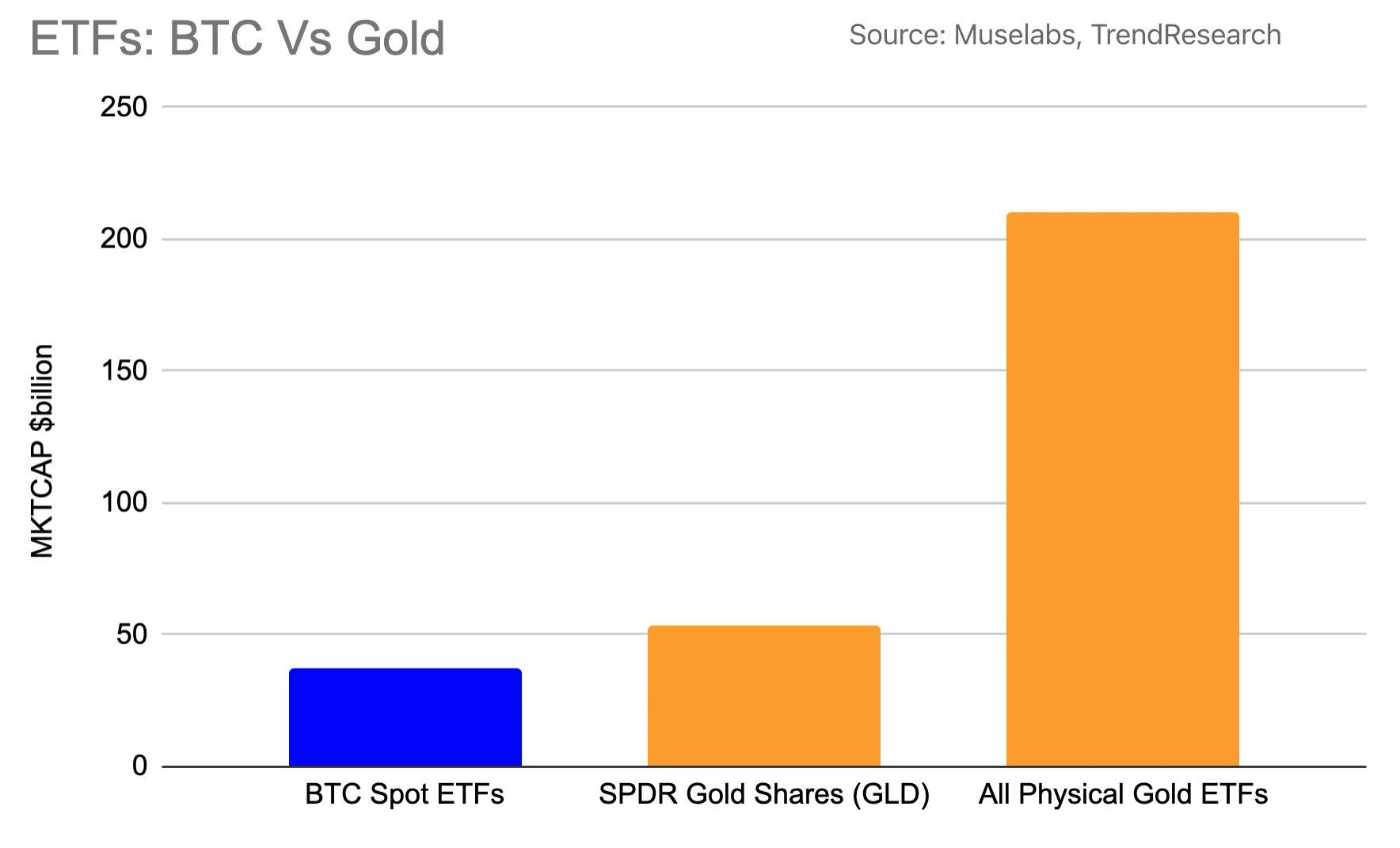 当前比特币现货 ETF 的市值 $ 37 B 黄金是$ 210 B,占比 17.6% ;如果只看最大流动性最好的$GLD 则是 54 B,占比 69% ,比特币追赶黄金的速度令人惊讶: