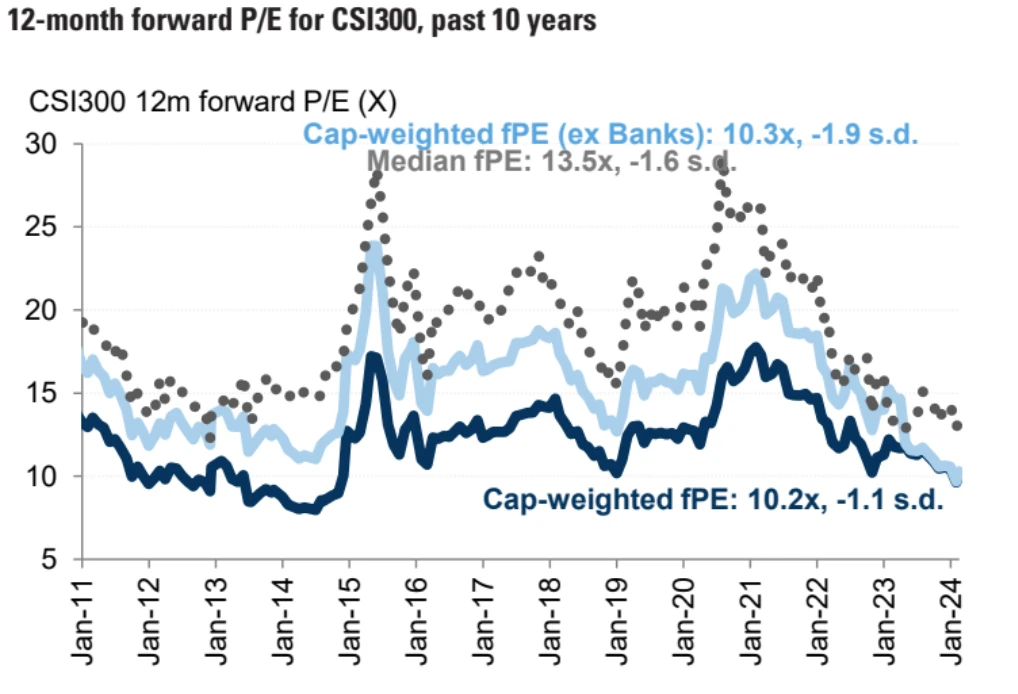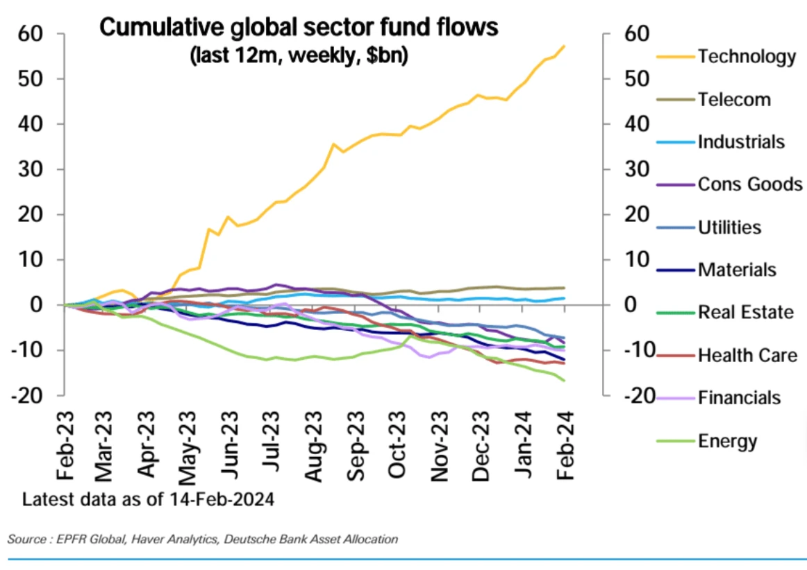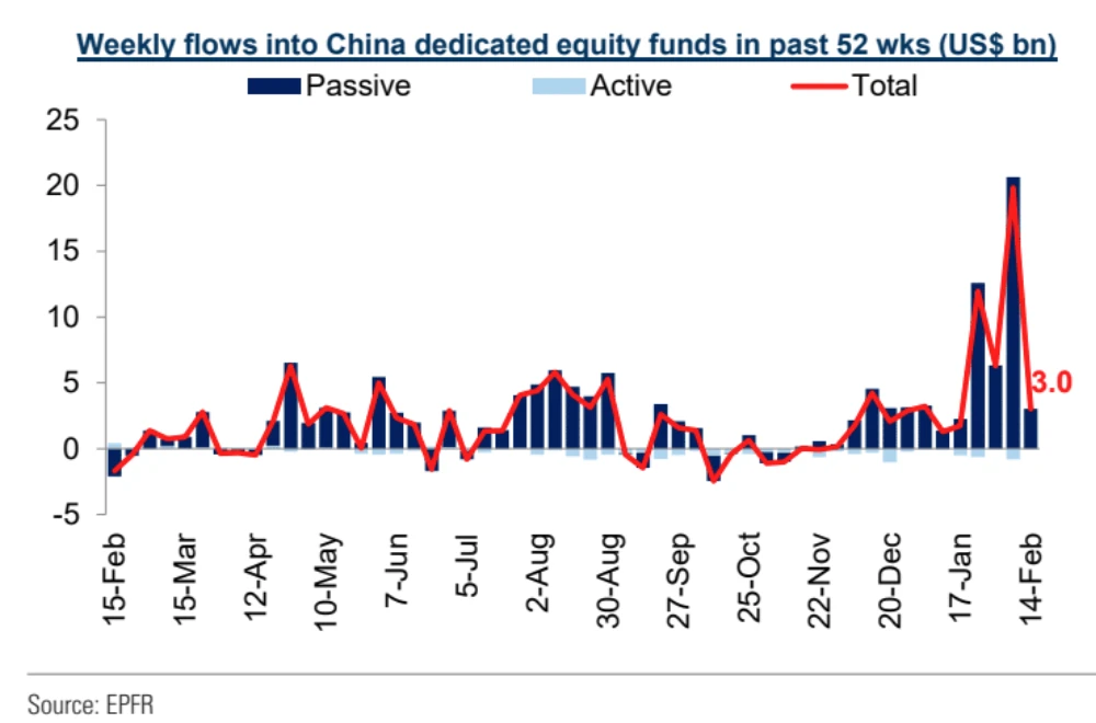 疑似国家队买入在支撑市场,过去四周 EPFR 追踪的中国股票基金净流入 440 亿美元,当然因为上周春节假期,数据值包含了 2 月 8 – 9 号的流入情况,单周数据可能被低估: